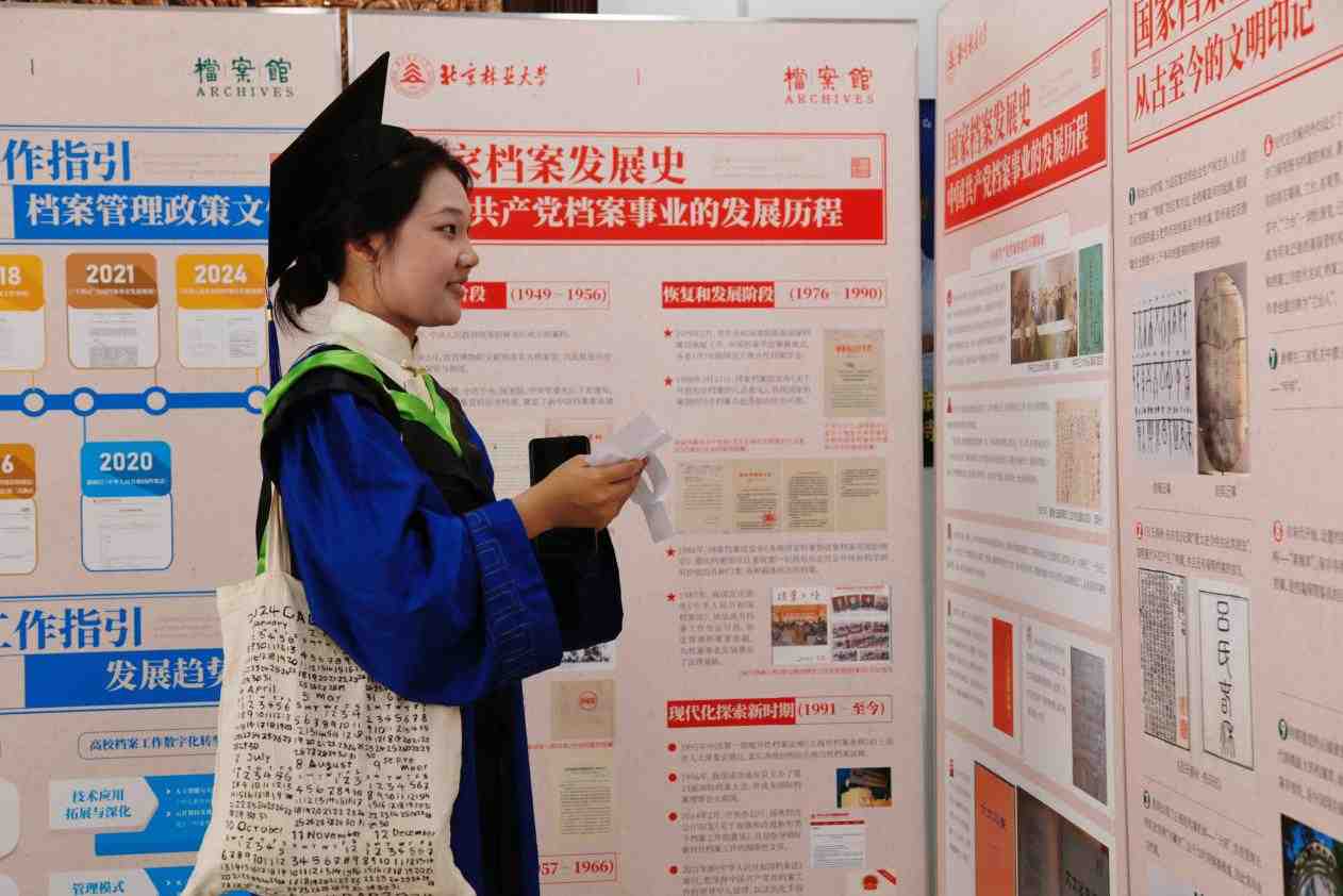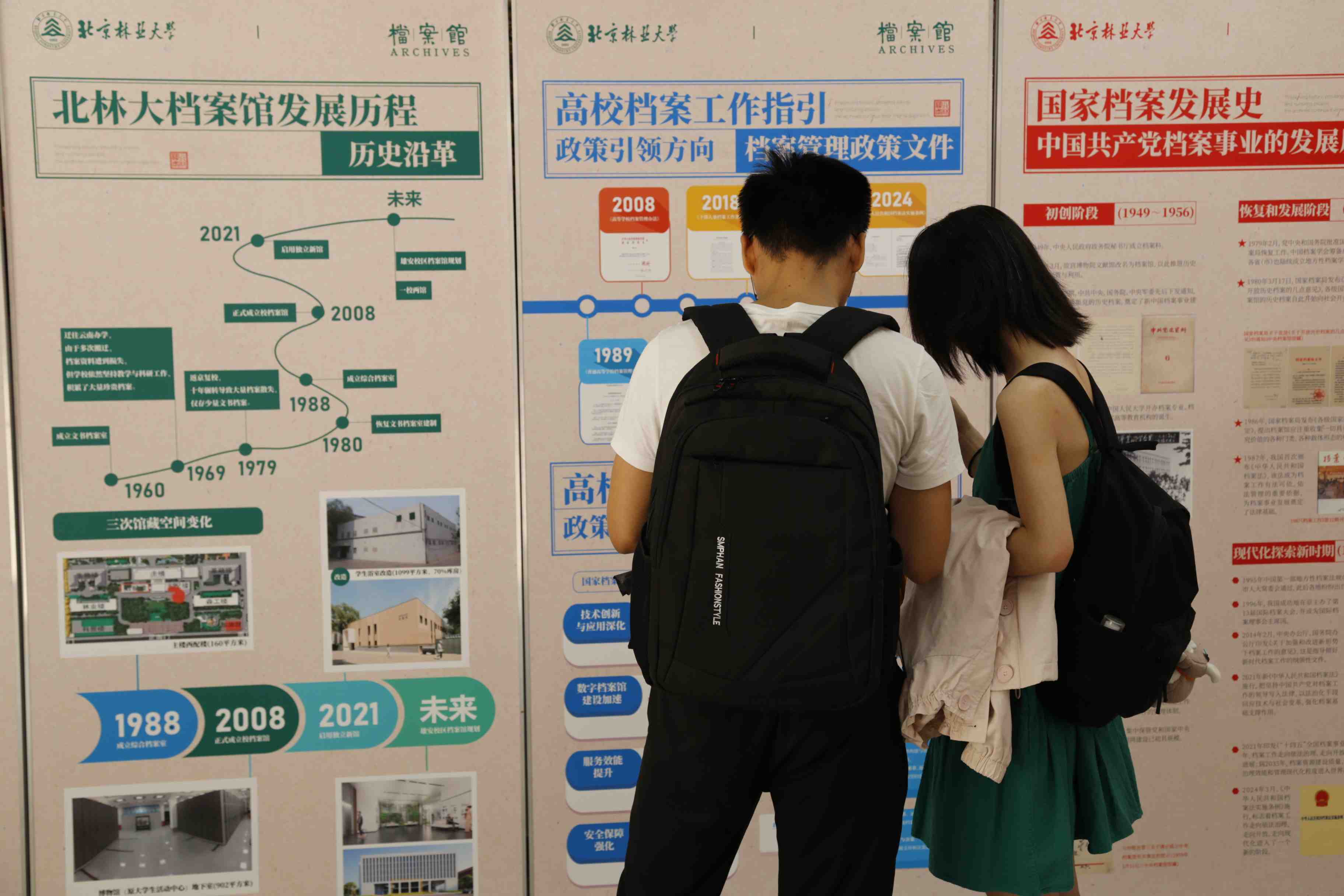 档案是文明传承的无声见证者,亦是时代发展的忠实记录者。本次展览系统梳理了从甲骨金石到数字档案的发展脉络, 展示了中国共产党档案事业发展史及档案现代化的发展方向。我校档案工作发展部分,聚焦展示北林发展历程、徽章演变及党和国家领导人的关怀,精选珍贵馆藏实物档案的照片,以档案为媒,让沉睡的卷宗讲述有温度的发展故事。展览配有音频讲解,观展者络绎不绝、深读品味。